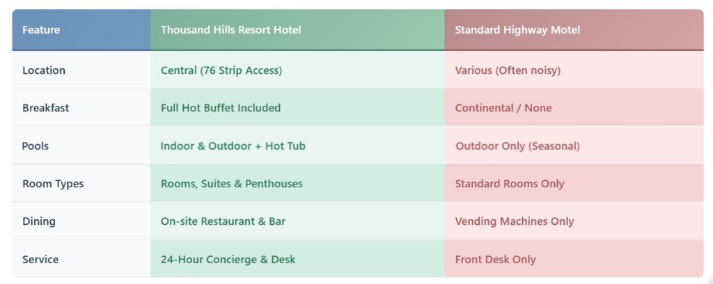 Many visitors debate between booking a full-service resort hotel or a basic budget motel. Thousand Hills offers superior value through its amenities and location.