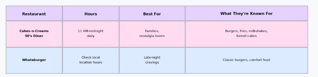 Cakes-n-Creams 50’s Diner stays open until midnight daily serving burgers, fries, and milkshakes. Some Whataburger locations may offer extended hours (verify specific Branson location times).