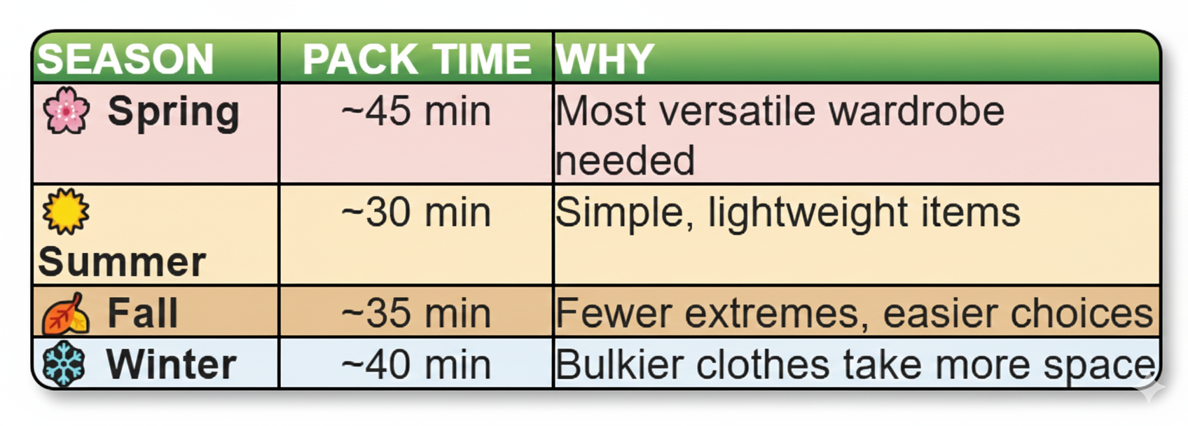 - Essential items vary by season: light jackets for spring, swimwear for summer, and warm layers for winter.