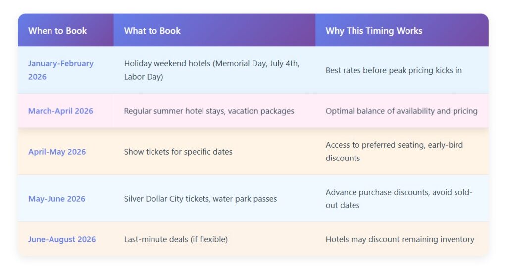 - Booking early for Branson Summer 2026 ensures lower rates and better room choices, especially if done by March or April.