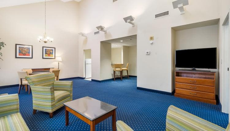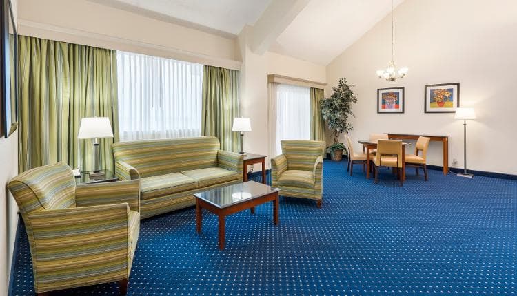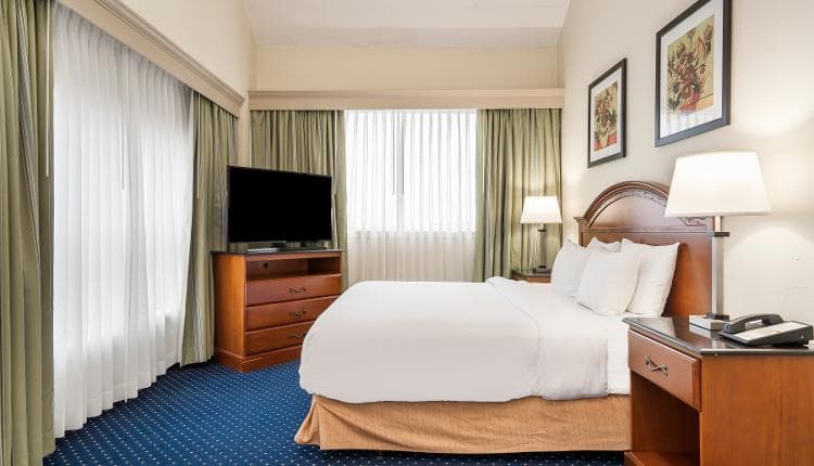 The Presidential King Suite features a separate living room with a sleeper sofa, a kitchenette, and a dining area. Enjoy a whirlpool tub, walk-in shower, and private walk-out balcony with incredible views of Branson.